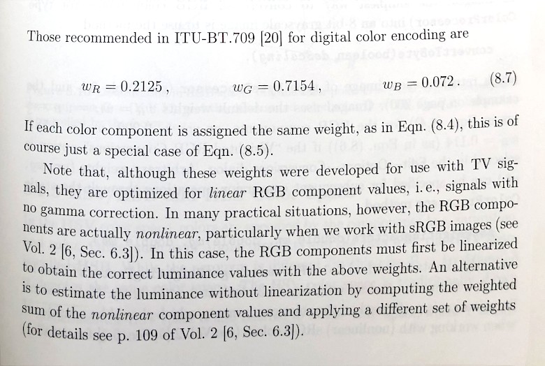 Hey, these dudes get it! The exact weights they show are from the older “BT.709-1” spec, though. Anyway, there’s an intriguing reference “p. 109 of Vol. 2”, offering “a different set of weights” optimized for nonlinear aka gamma-corrected values. At home, I found the relevant chapter on Google Books and it shows us the new coefficients: