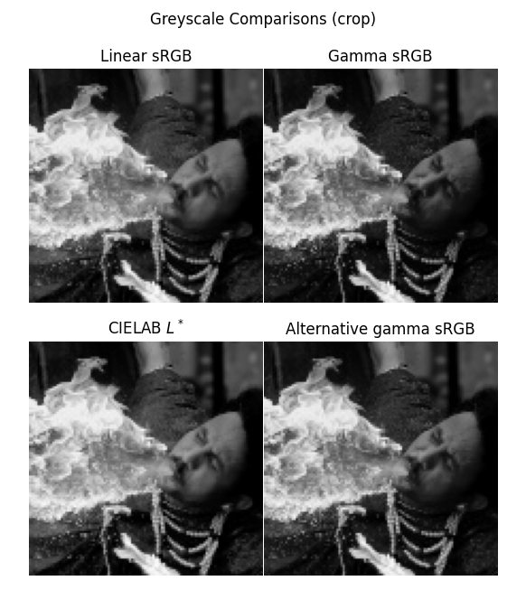 In other words, the standard recommends you compute a gamma-corrected grey value with gamma-corrected RGB inputs using coefficients meant for linear space. Yikes! I’m not familiar with the history of that unfortunate decision, but at least I know how to do greyscale conversion right: